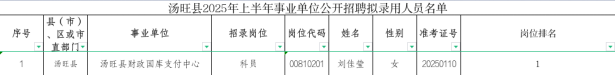 汤旺县2025年上半年事业单位公开招聘引才活动拟录用人员补充公示