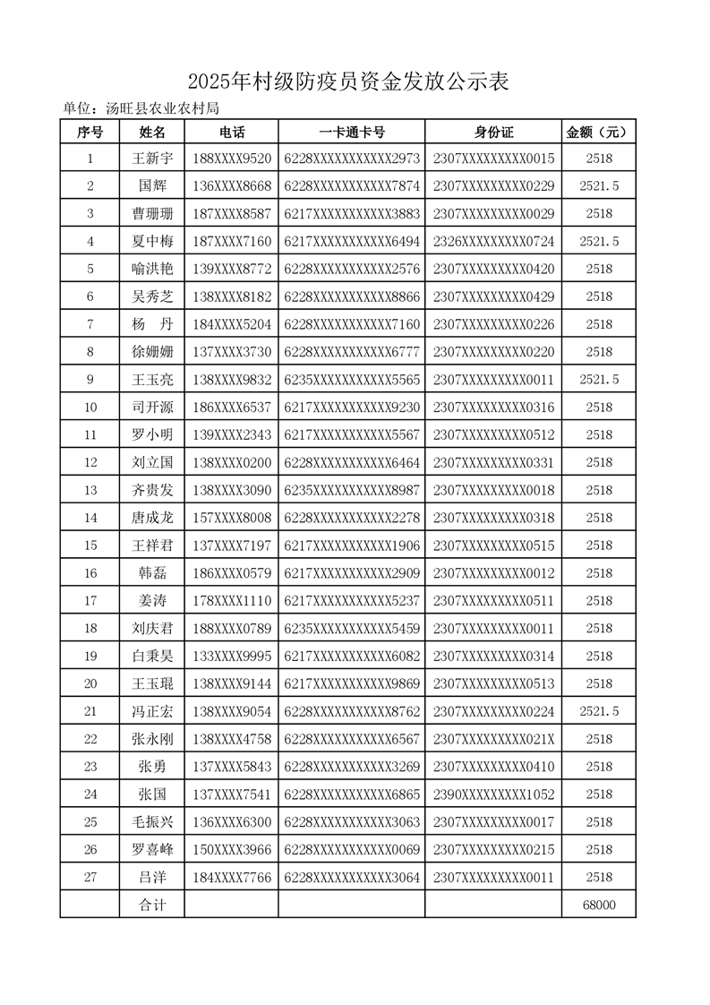 汤旺县农业农村局2025年村级防疫员资金发放公示表