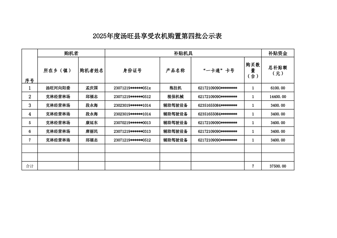 2025年度汤旺县享受农机购置第四批公示表