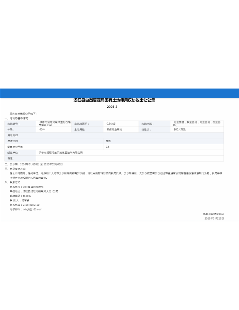 汤旺县自然资源局国有土地使用权协议出让公示