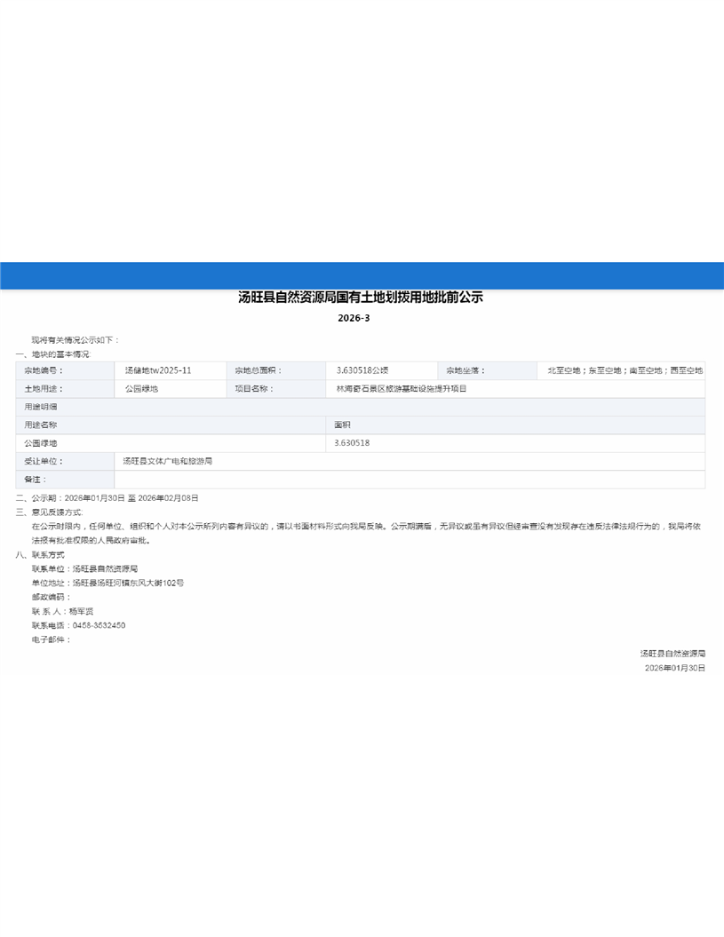 汤旺县自然资源局国有土地划拨用地批前公示2026-3