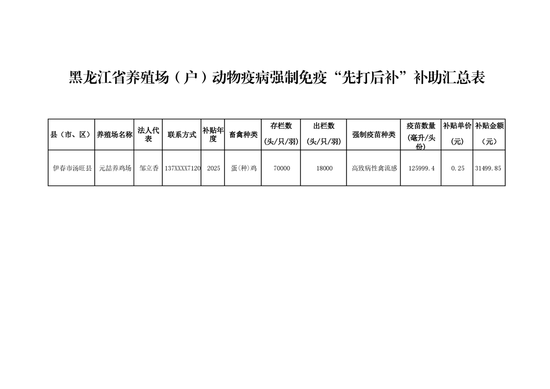 (2025年)汤旺县农业农村局强制免疫“先打后补”补助汇总表