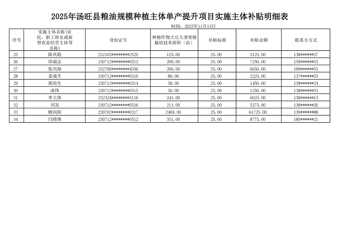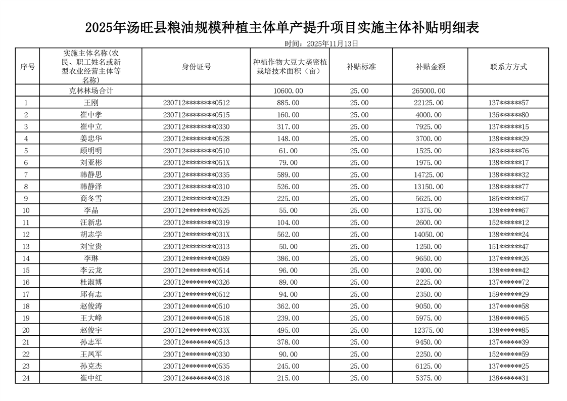 2025年汤旺县粮油规模种植主体单产提升项目实施主体补贴明细表